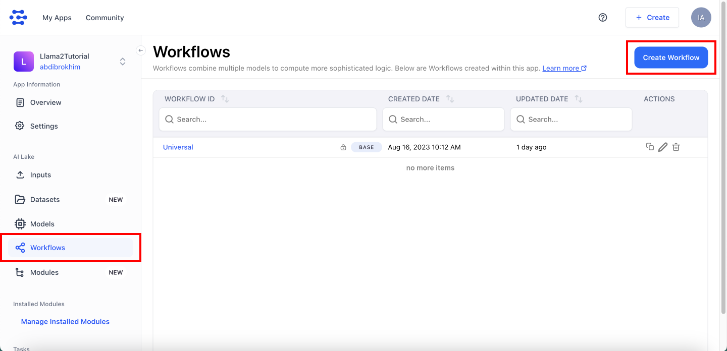 From the app page, select Workflows from the left sidebar and click on the Create Workflow button.