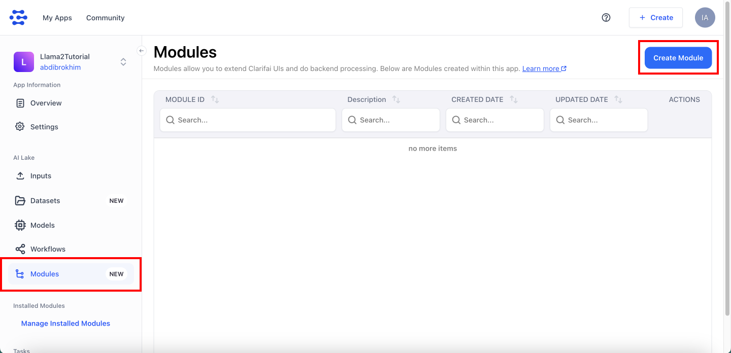 Now, from Clarifai app page, select Modules from the left sidebar and click on the Create Module button.