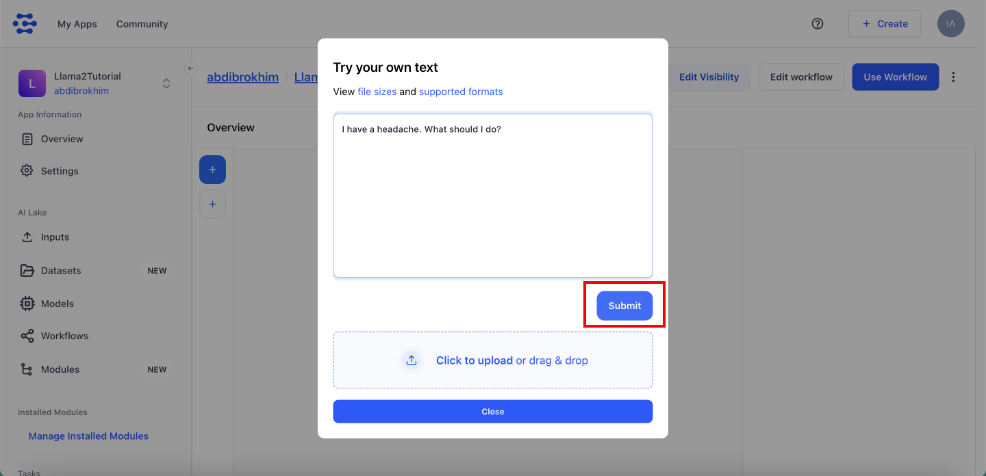 Go to the Llama2TutorialWorkflow, click on the Use Workflow, from tab select Call by API, then click Copy Code.