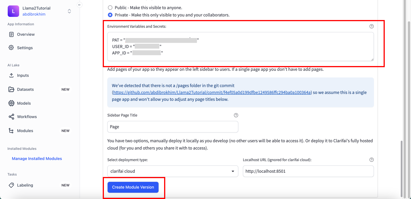 Scroll down a little bit and enter your github repository url with branch specified. Fill in the required fields and click on the Create Module Version button.