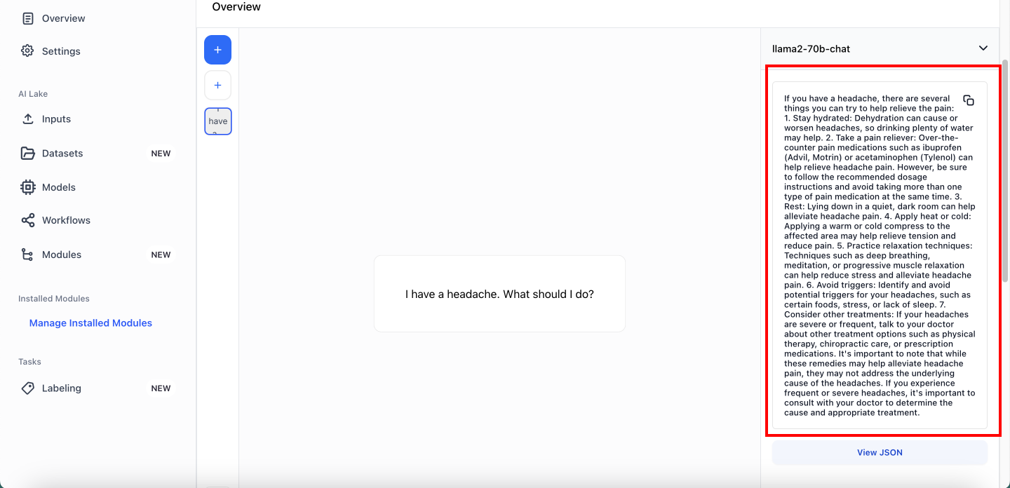 Wait for a few seconds, and you will see the response from the model on the right side of the screen. In addition to the response, you can go through JSON response from the model by clicking on the View JSON button.