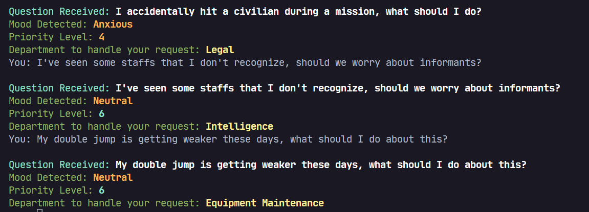 This function receives user messages as input, generates a loading animation, and initializes the Cohere API client. It classifies the user's mood and the responsible department based on these messages, then stops the loading animation. It also maps moods to priority levels and prints the user's mood, its priority level, and the responsible department in a user-friendly format.