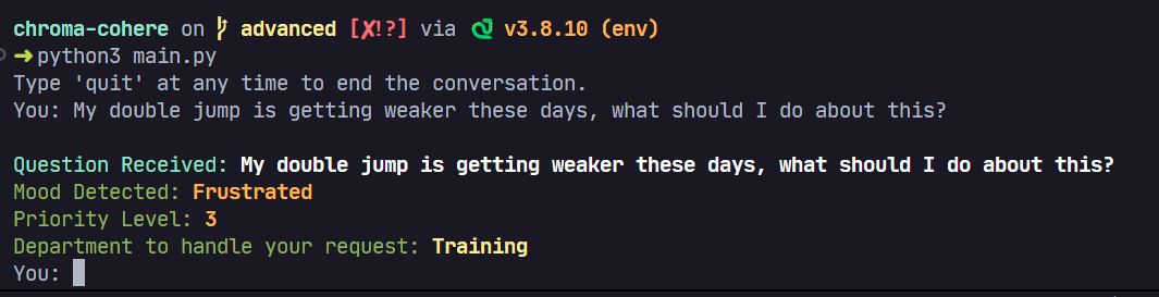 If things go well, we should see the same input prompt that was shown in our previous test. Let's test the application with a previously problematic query: "My double jump is getting weaker these days, what should I do about this?".