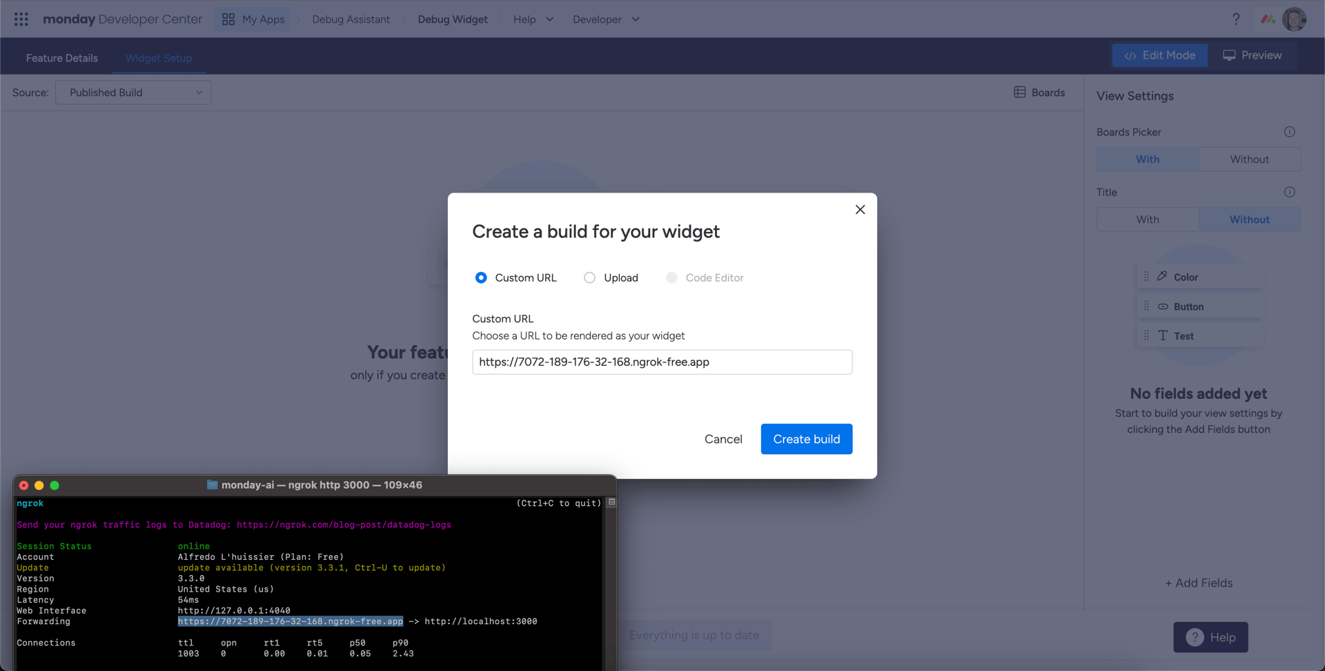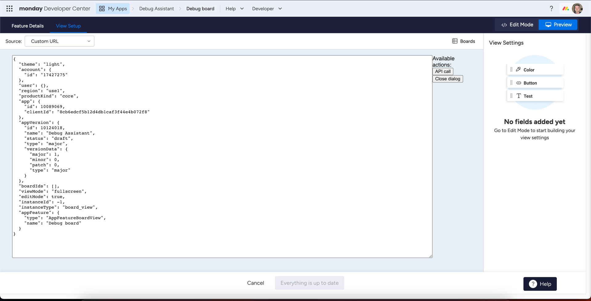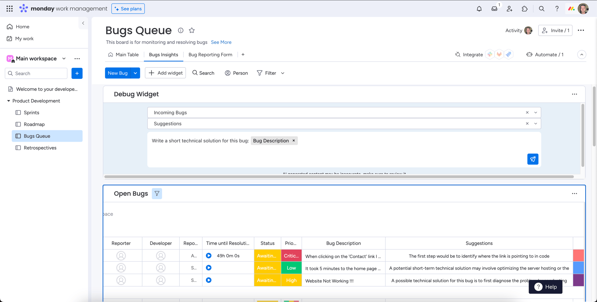We are ready to start testing our app! Go back to Bug Queue -> Bug Insights board on Monday.com, and open the Debug Widget. The new UI should be running inside it. You might need to reload the page.