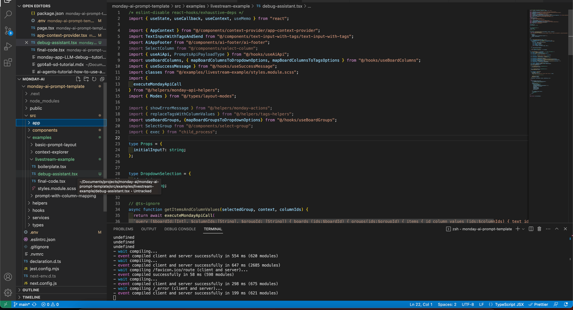 Go back to your code editor, and copy the boilerplate file located at monday-ai-prompt-template/src/examples/livestream-example/boilerplate.tsx, then paste it in the same directory and rename it to "debug-assistant.tsx". We will write most of our code here.