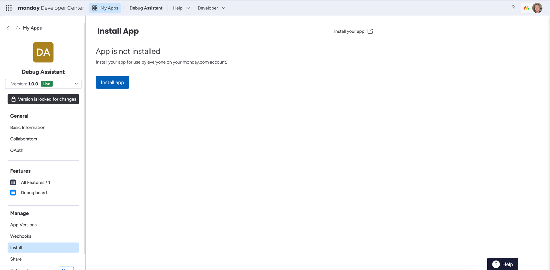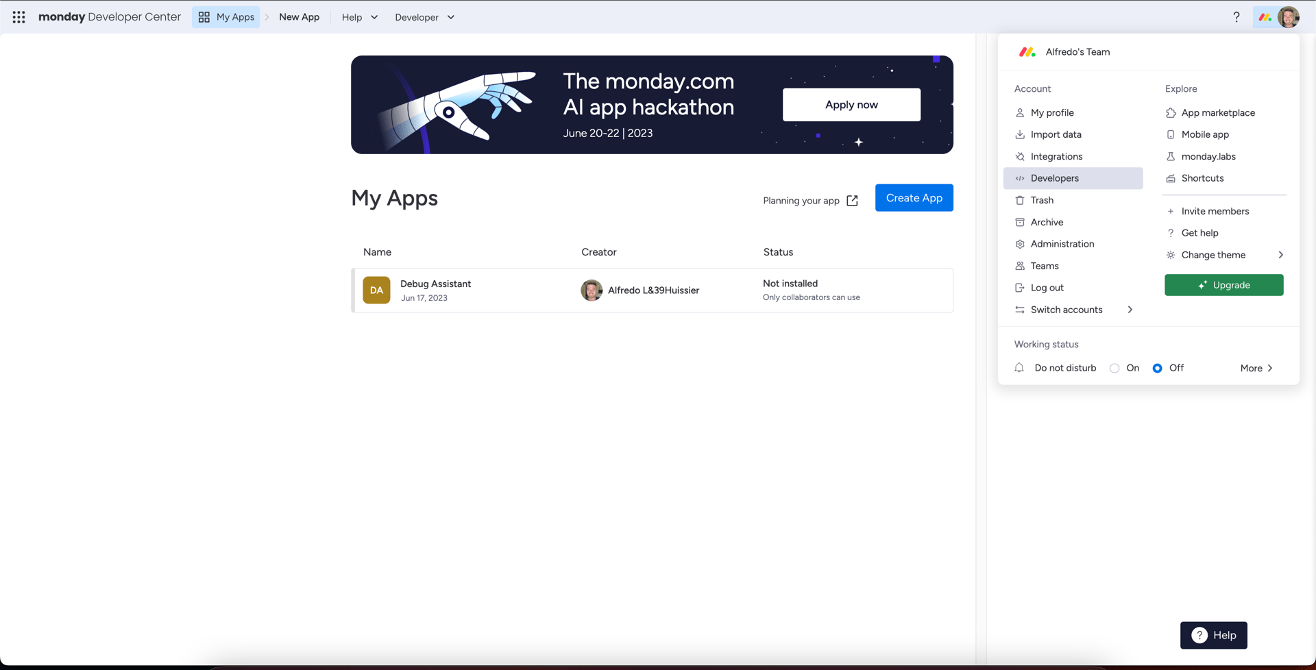 Now, click on your avatar -> Developers and press the "Create app" button. Let's call it Debug Assistant.