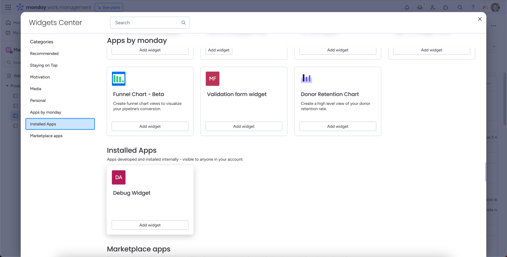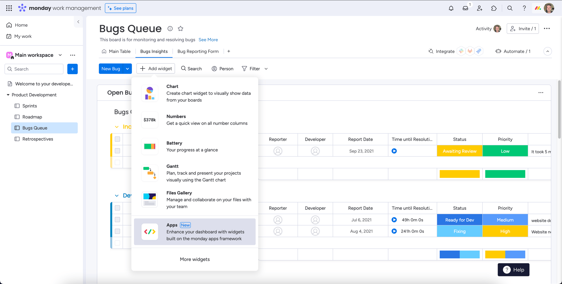 Your should now be able to add your app to your Monday board. Go back to your workspace, and open the Bug Insights view on the Bug Queue board, then click on Add Widget -> Apps.