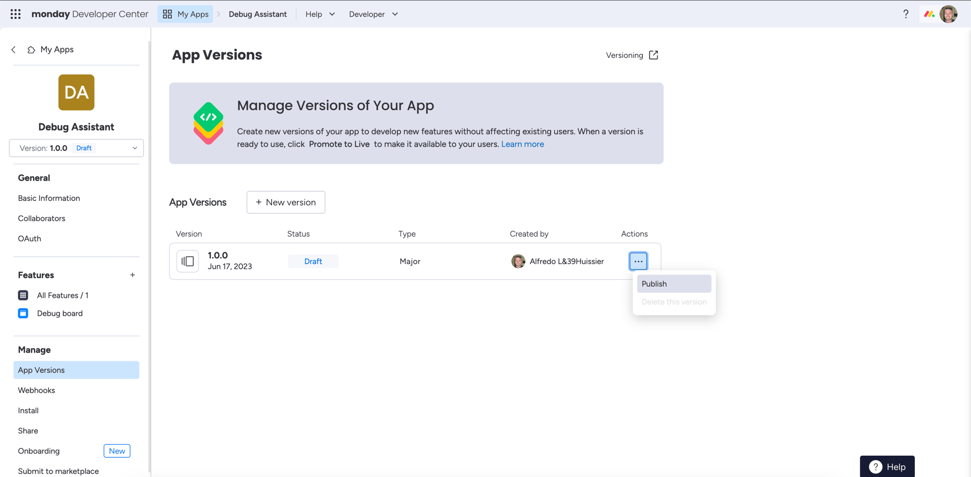 Go now to your app's dashboard, click on App Versions. Click on the three dots of your app's first version, and publish it.
