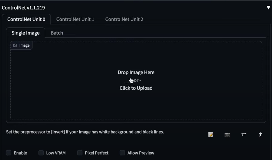 You remember, that we needed to have 2 control net windows. So we will need to upload our QR codes into both “controlNet Unit 0” and “controlNet Unit 1” tabs, and in each of them tag the field “enable”.