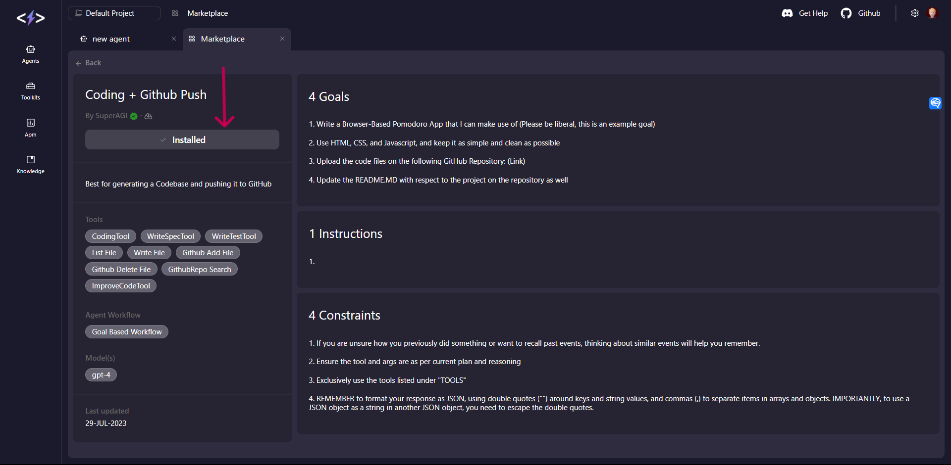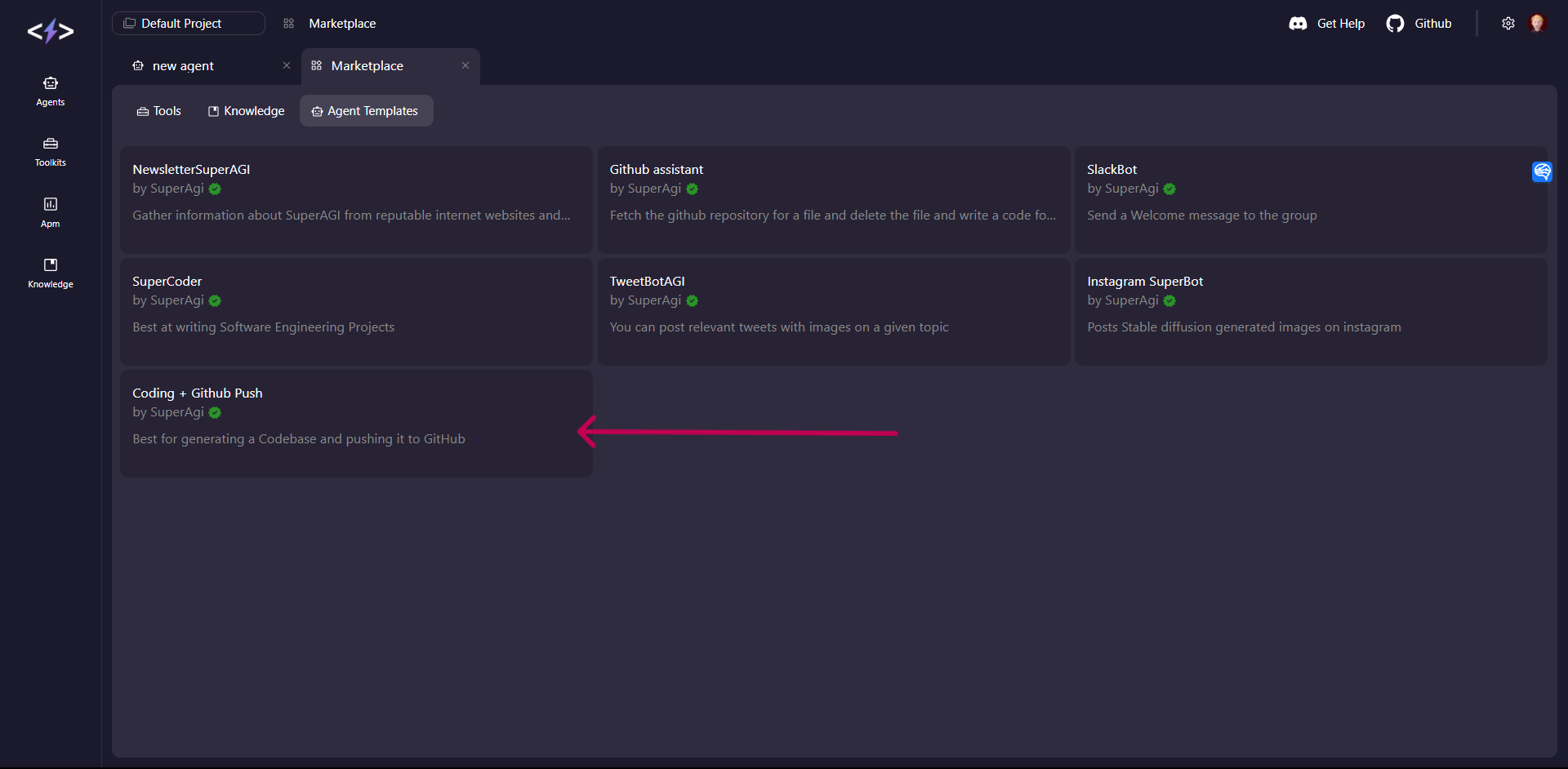 In this tutorial we will use an Agent Template from SuperAGI. I will show you how to set up the “Coding + Github Push” Agent template in detail: