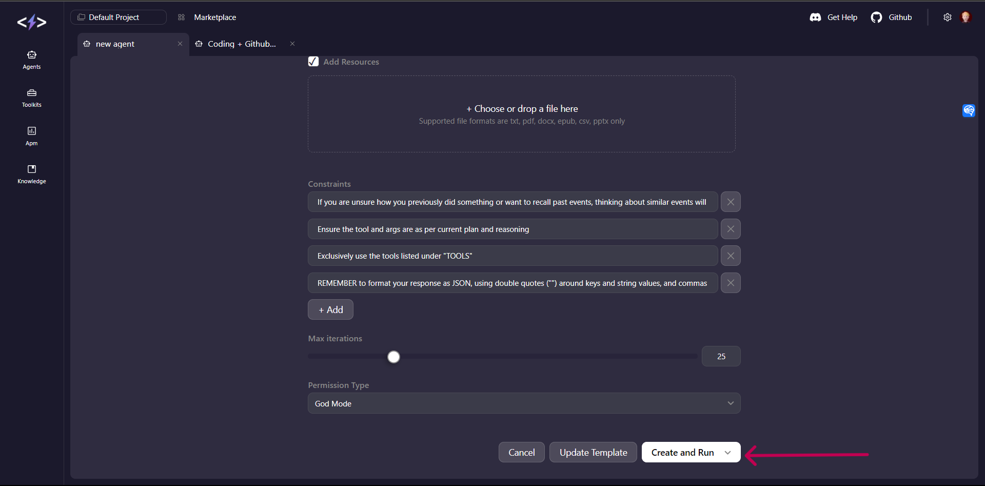 - Create a new Agent and select the “Coding + Github Push” Agent template