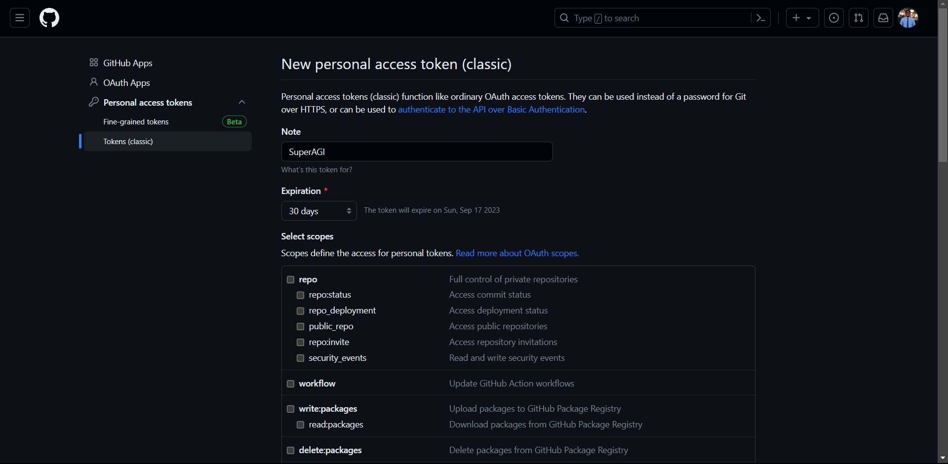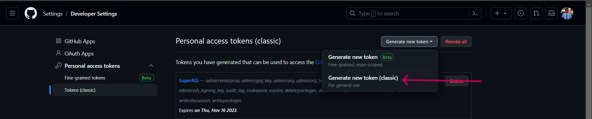 - Click on "Generate new token". Then choose "Generate new token (classic)".