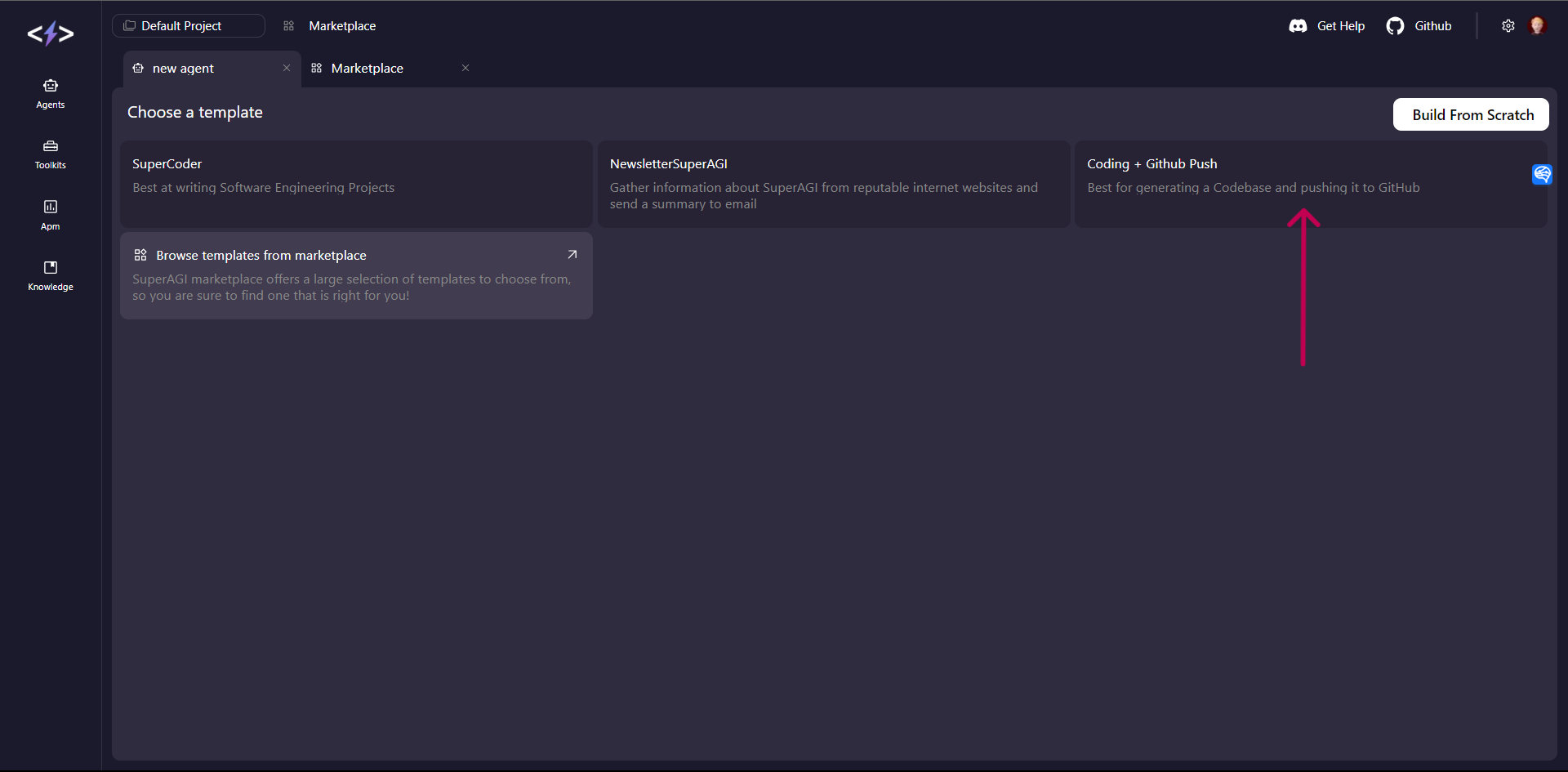 - Go to the Marketplace and select the “Coding + Github Push” Agent template
