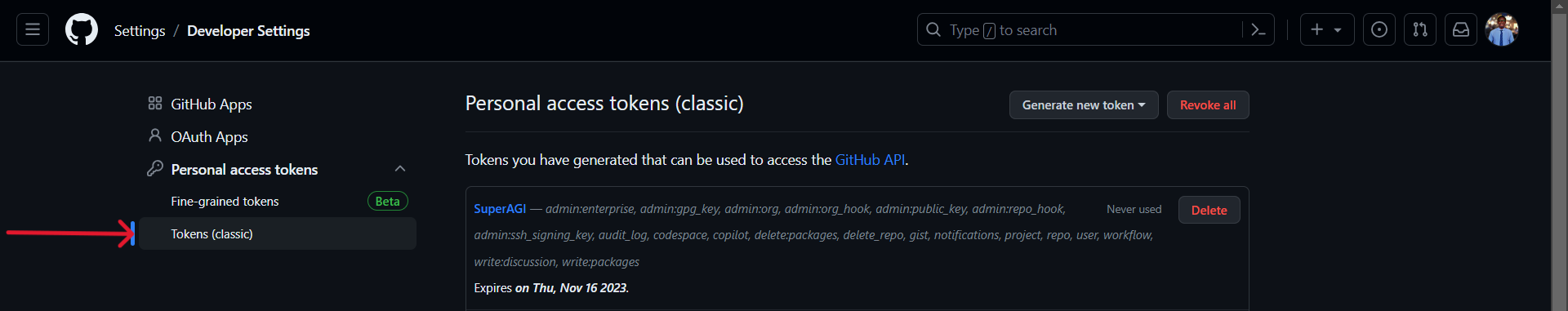- Click on "Personal access tokens". Then click on "Tokens (classic)".